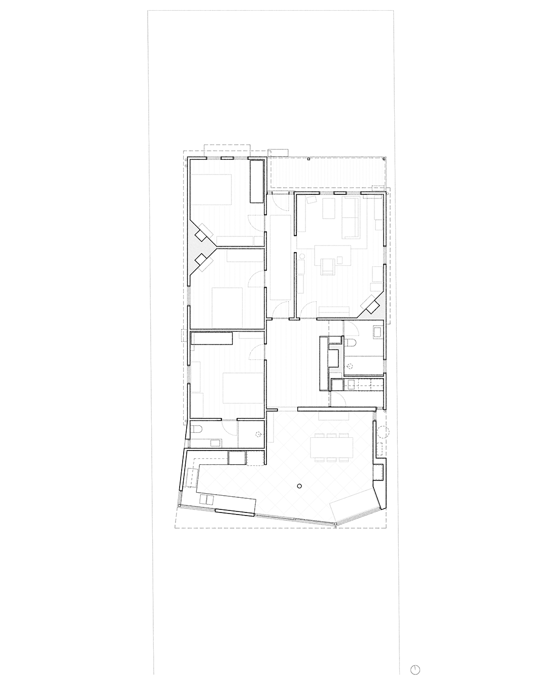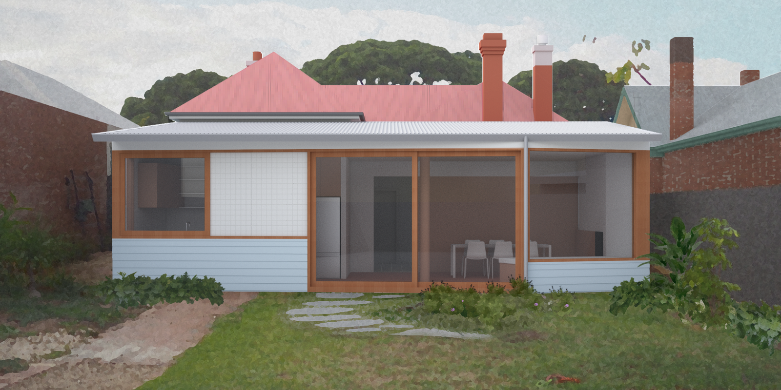 An alteration and addition to an early twentieth-century weatherboard cottage in the inner-north Melbourne suburb of Brunswick for a young couple. A new dining room and kitchen is added, as well as an ensuite and laundry. The addition is conceived as a garden room, at once within and looking onto the expansive backyard.
